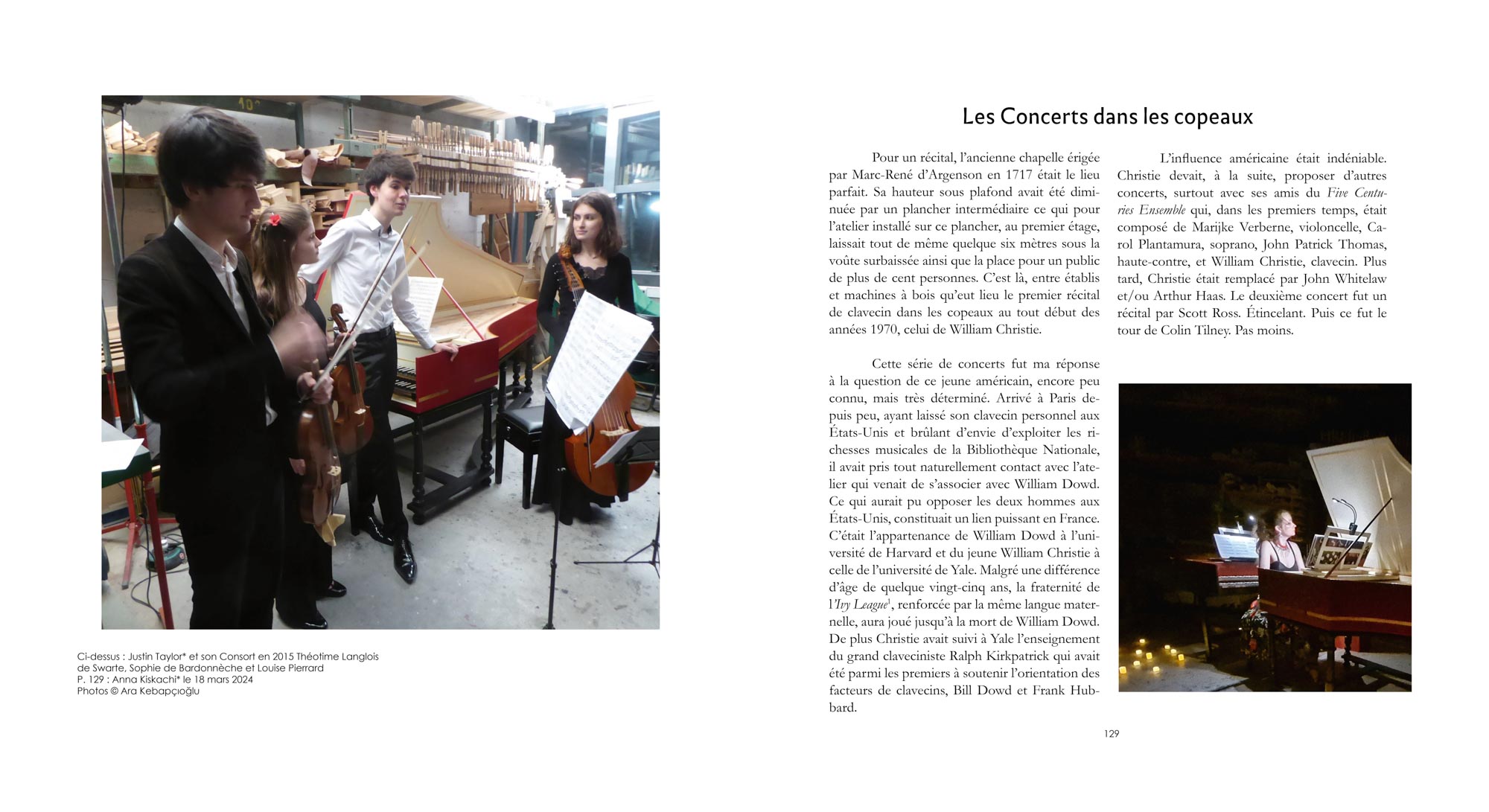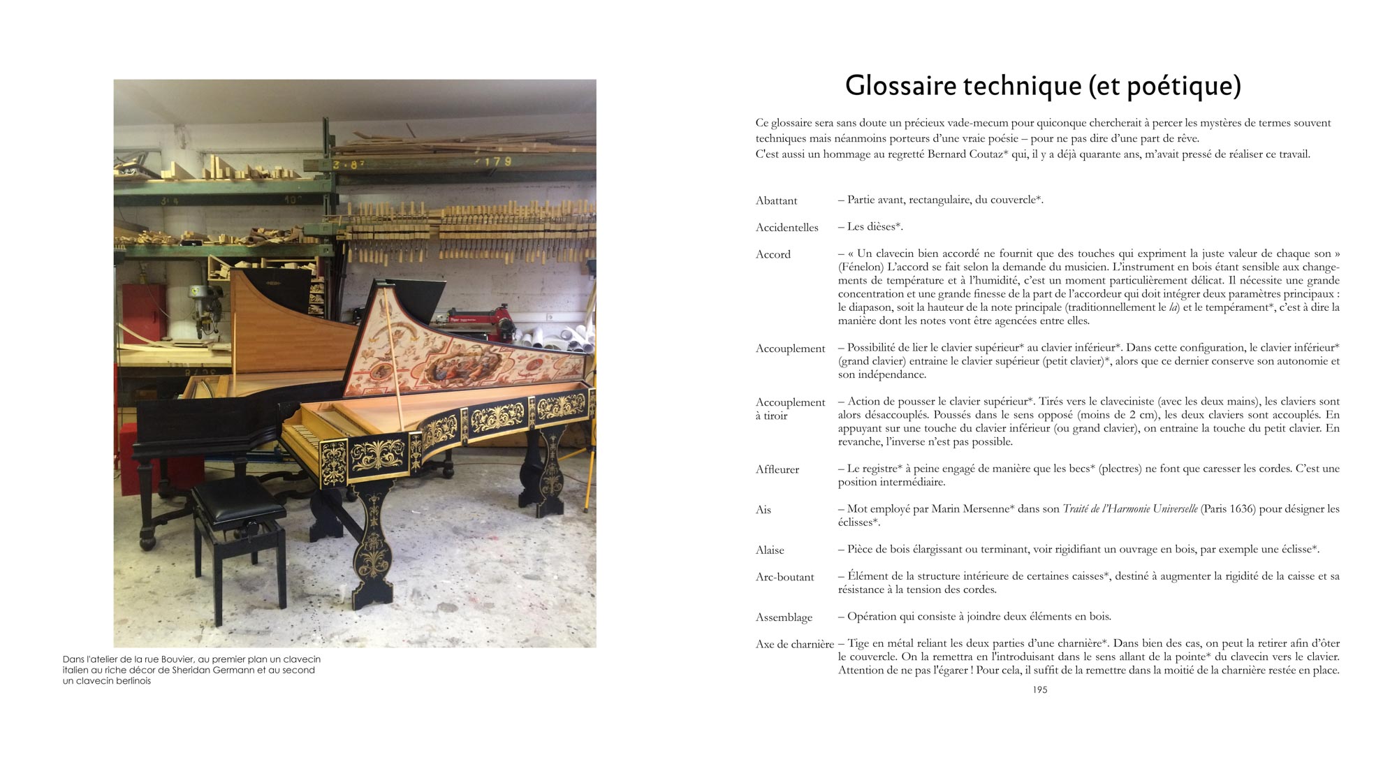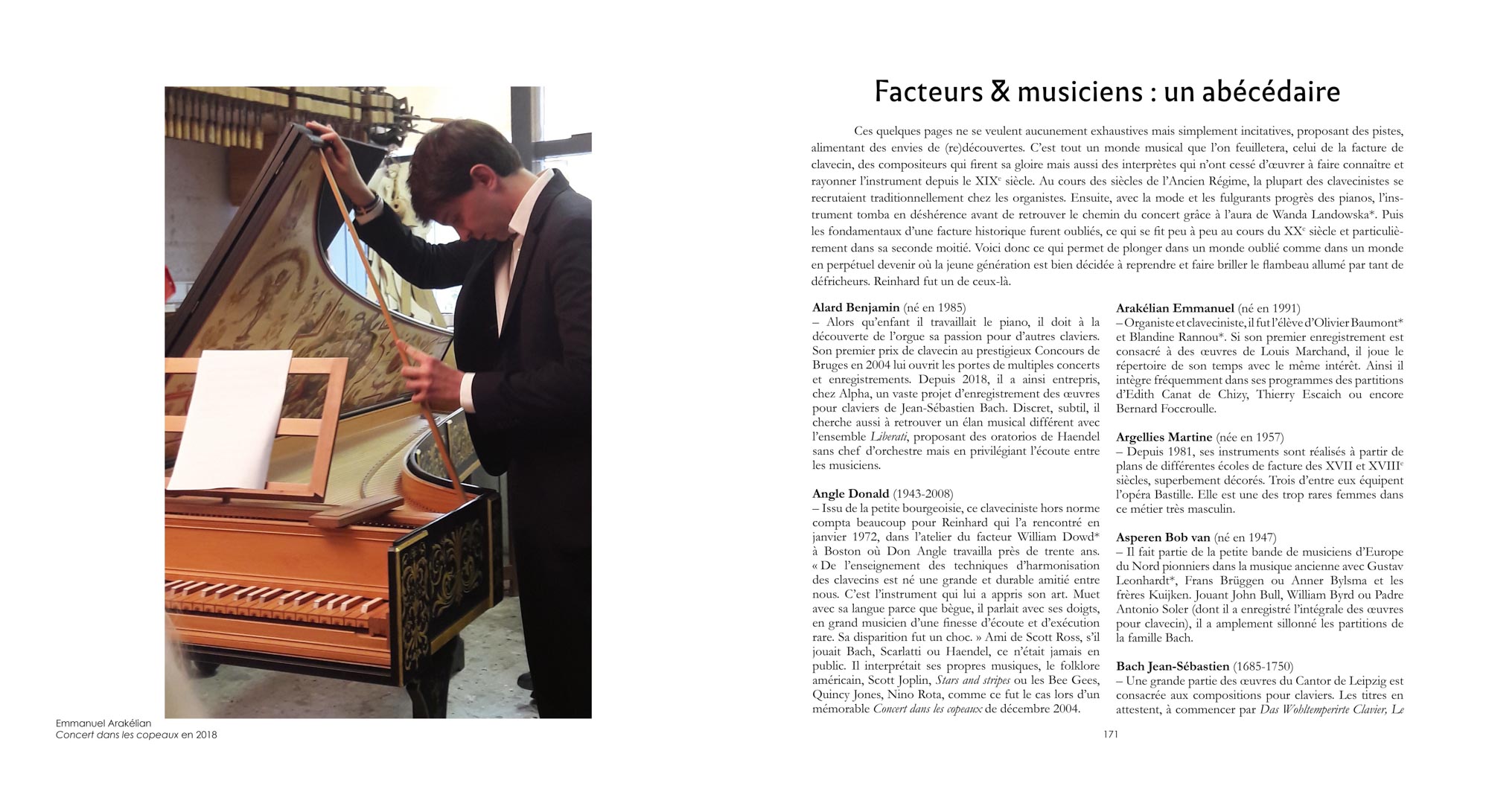 Un dernier chapitre est consacré à un Abécédaire suivi d’un Glossaire afin de saisir ce monde en perpétuel devenir ; les facteurs de clavecins toujours très actifs et les jeunes musiciens, tous bien décidés à faire briller le flambeau allumé par les défricheurs.