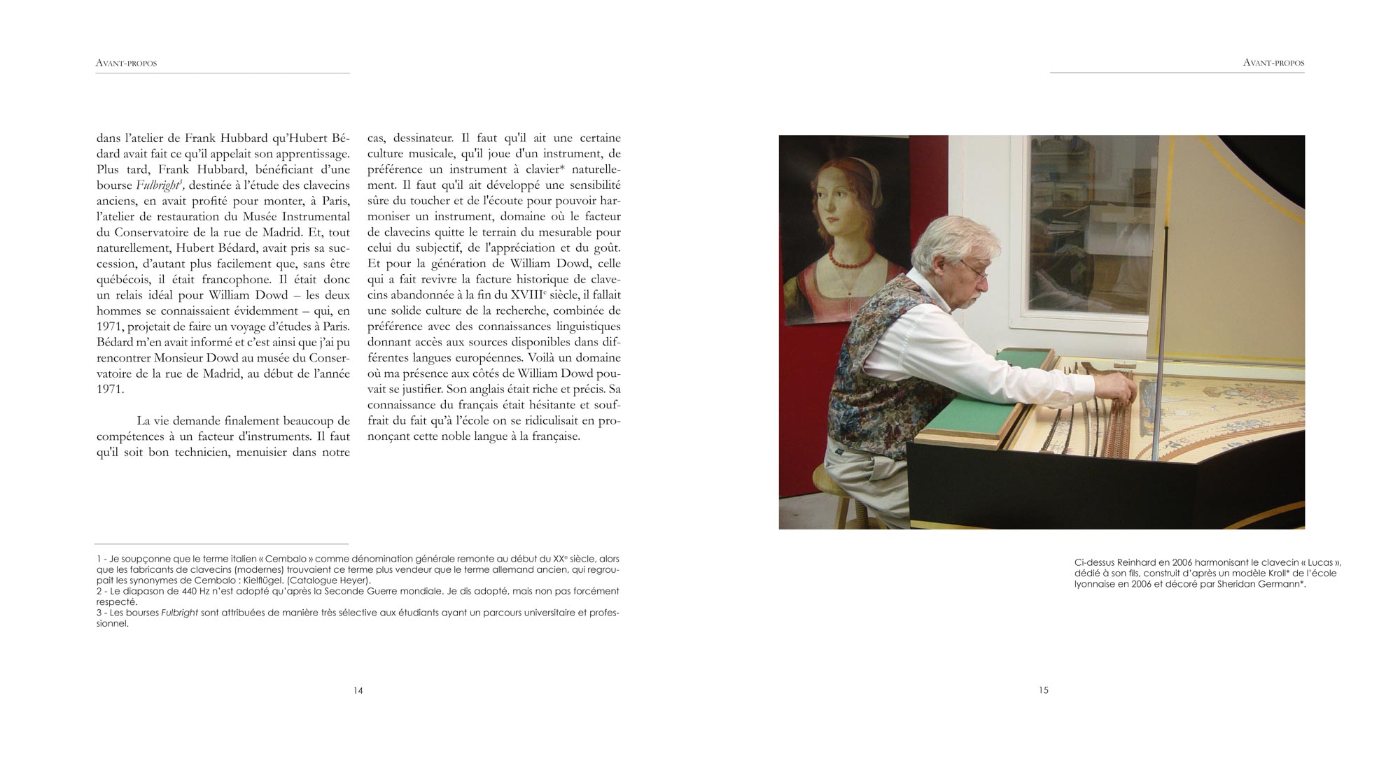 Cet ouvrage a été conçu comme un hommage au facteur de clavecins Reinhard von Nagel et à ses mentors : Hubert Bédard qui dirigea l’atelier de restauration du Musée instrumental du Conservatoire de Paris, Franck Hubbard et William Dowd, deux jeunes étudiants de l’université de Harvard. Ensemble, ils décidèrent au cours des années 70 de se consacrer à leur passion, la musique et les clavecins en respectant leurs caractéristiques historiques. Chacun à sa manière va être le mentor de Reinhard von Nagel pour aborder la facture de clavecins à la manière des anciens c’est-à-dire comme une œuvre d’art à part entière.